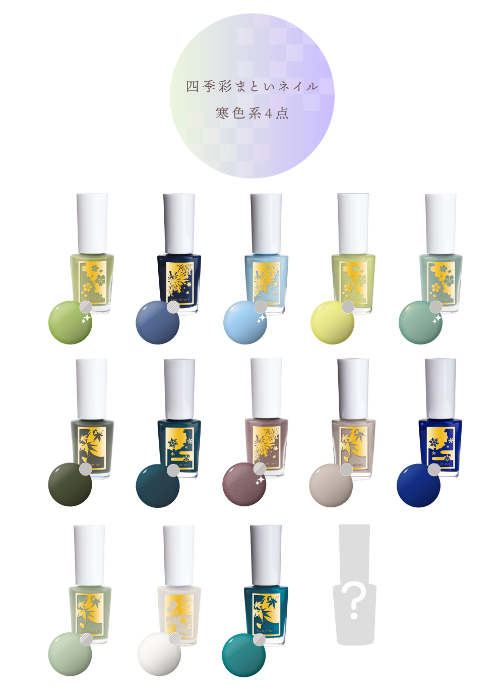 【002 霞立つ・105 薄荷香・106 きみまち花・108 木の芽萌ゆ・202 タ立の雲・204 あじさいに露・206 暮れる砂浜・302 とこしえに・305 深蒸し茶・307 文一葉・310 霧眺む朝・403 冬の水・407 しづごころ・<限定色>】